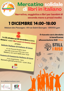 Dimanche 1er décembre de 14h00 à 18h00 Maison des Passages : 44 rue Saint-Georges – 69005 Lyon Romans, essais et livres pour enfants d’occasion à prix modiques. Les dons seront au bénéfice de l’association Still I Rise. Jusqu’au 29 novembre, vous pouvez donner vos livres en bon état à l’Institut Culturel Italien de Lyon, 18 […]