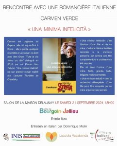 Samedi 21 septembre à 18h00 Salon de la Maison Delaunay. Bourgoin-Jallieu CARMEN VERDE devait venir en début d’année, elle nous avait promis d’honorer ce rendez-vous. C’est un immense plaisir d’accueillir une romanciére finaliste du Premio Strega (le Goncourt italien) avec son premier roman « Una minima infelicità ». Un titre émigmatique que l’on sait pas vraiment traduire : […]