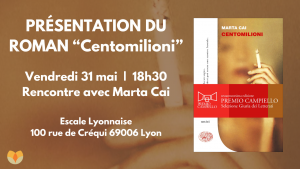 vendredi 31 mai Lucciola Vagabonda va accueillir à Lyon l’écrivaine Marta Cai, pour une présentation en présentiel de son premier roman « Centomilioni ». Le roman, faisant partie de la sélection italienne du festival du premier roman de Chambéry de cette année, suit l’histoire de Teresa : enseignante célibataire, elle vit encore avec ses parents à […]