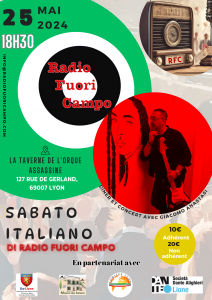 Radio Fuori Campo est heureuse de vous inviter à son premier samedi de musique italienne SAMEDI 25 MAI 2024 LIEU: TAVERNE DE L’ORQUE ASSASSINE 127 rue de Gerland 69007 Lyon (France) Un buffet dînatoire accompagné du concert du chanteur et compositeur italien Giacomo Anastasi, qui interprétera des chansons qui ont marqué l’histoire de la musique […]