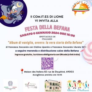 Samedi 6 janvier à 16h00 Maison des Italiens 82, Rue du Dauphiné 69003 Lyon Spectacle en italien avec Cristina Liporato et Francesca Zoccarato, de la compagnie Teatro Bandito, proposé par le Com.it.es de Lyon à l’occasion de la fête de la Befana. Entrée gratuite mais inscription obligatoire : cliquer sur le lien https://forms.gle/gxck2vthLmiQgpjb6) Après le […]