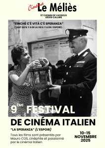 Dal 10 al 15 novembre Cinéma Le Méliès 67 Chem. de Vassieux, 69300 Caluire-et-Cuire 🎬 9ᵉ Festival del Cinéma Italiano – “La Speranza” (10–15 nov. 2025) 6 giorni di cinema italiano presso il cinema Le Méliès ! In programma : l’anteprima del film Fuori (Mario Martone, 2025), il classico Pain, Amour et Fantaisie (Comencini, 1954), e altri 4 […]