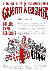 Venerdi 13 ottobre alle ore 18:00 Institut Culturel Italien (Loft, RDC) 18, rue François Dauphin 69002 Lyon Nell’ambito della mostra Graffiti per pranzo/Graffiti à cuisiner, masterclass di tecnica figurativa tenuta da Yuri Romagnoli. Sono ammesse alla masterclass al massimo 15 persone.
